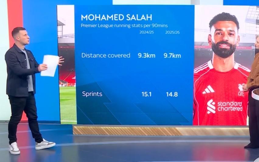 萨拉赫上赛季英超每90分钟跑动9.3公里,本赛季9.7公里