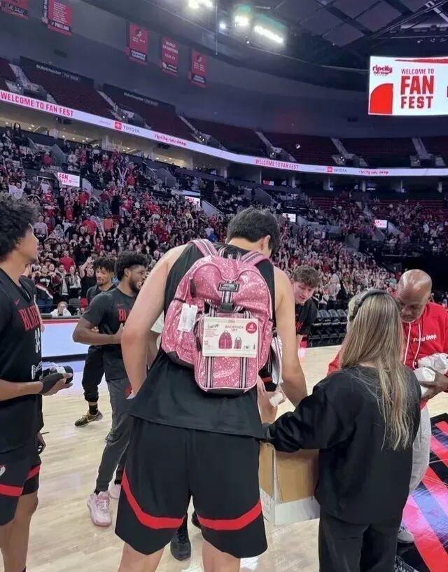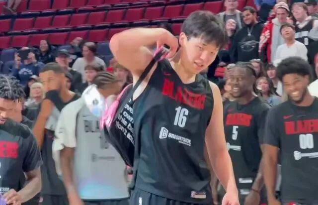 身为菜鸟的他,接过利指导的粉红小书包,现场载歌载舞,还赢得了开拓者官方的点名表扬: