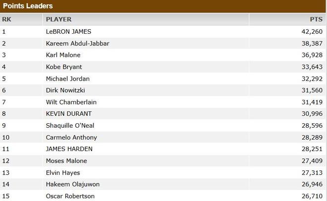 截至目前,詹姆斯以42260分排名NBA历史总得分榜第一位,杜兰特是现役球员得分第二名,目前得到了30996分。