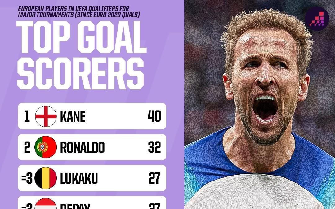 近4届欧预赛+世预赛射手榜:凯恩40球第1,C罗32球第2