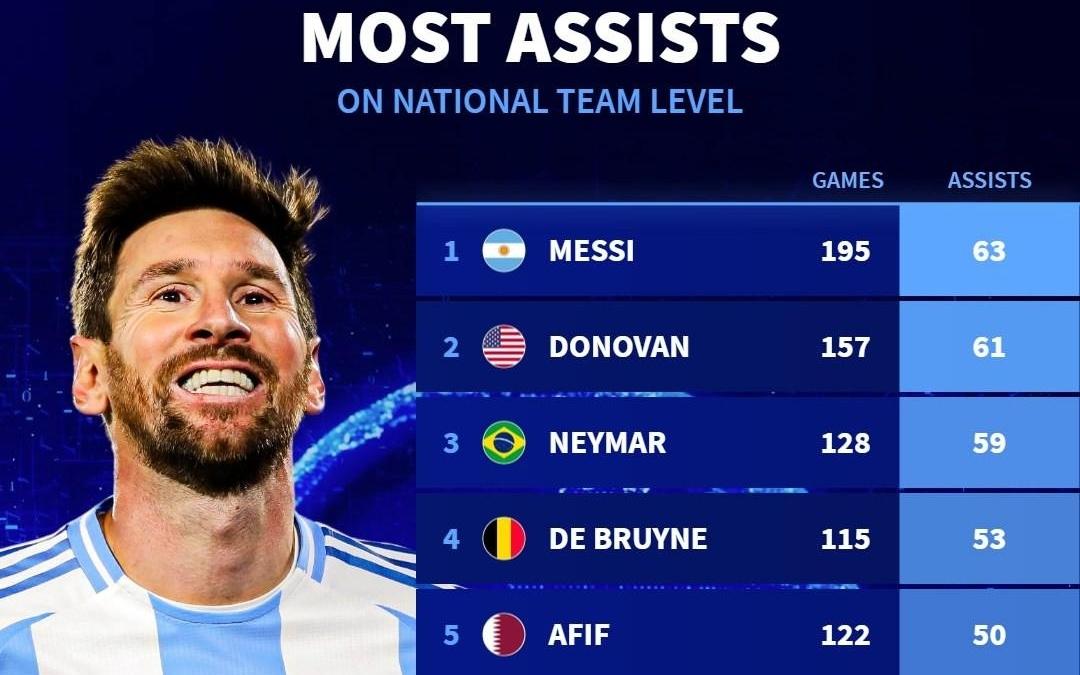 德转列国家队历史助攻榜:梅西63次居首,内马尔59次列第三