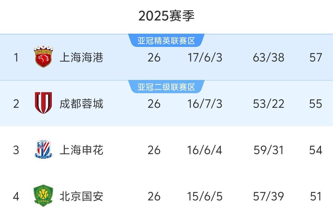 随着申花11蓉城,国安23海港,中超积分:3队争冠,1队掉链子