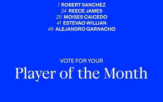 蓝军月最佳候选:桑切斯、詹姆斯、凯塞多、埃斯特旺、加纳乔