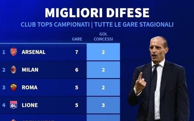 五大联赛球队各项赛事丢球最少榜:阿森纳7场2球居首,米兰次席
