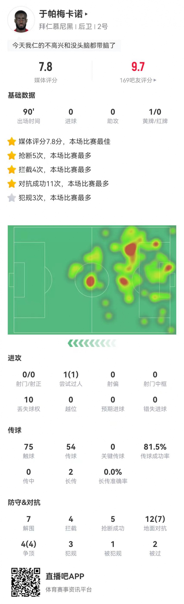 2月16日报道 拜仁在本轮德甲0-0逼平勒沃库森,于帕梅卡诺本场数据如下: