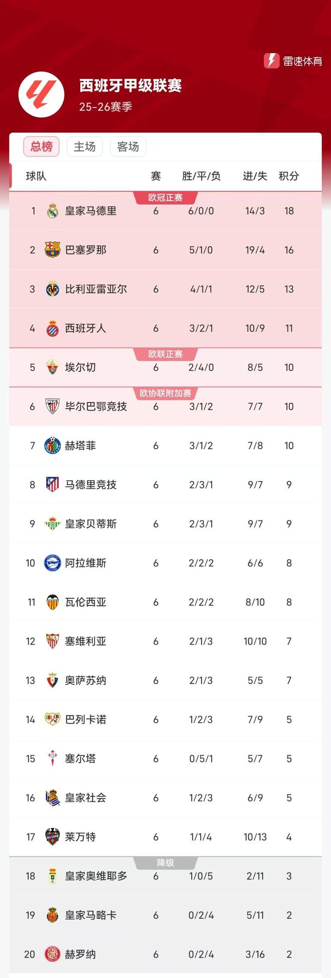 雷速体育9月26日宣 西甲联赛第6轮全部战罢,最新积分榜火热出炉,皇马仍旧排名榜首。