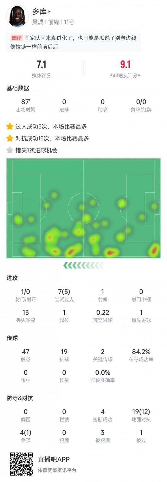 此役多库为曼城首发出战,成功过人5次、对抗成功13次,均为全场最多。