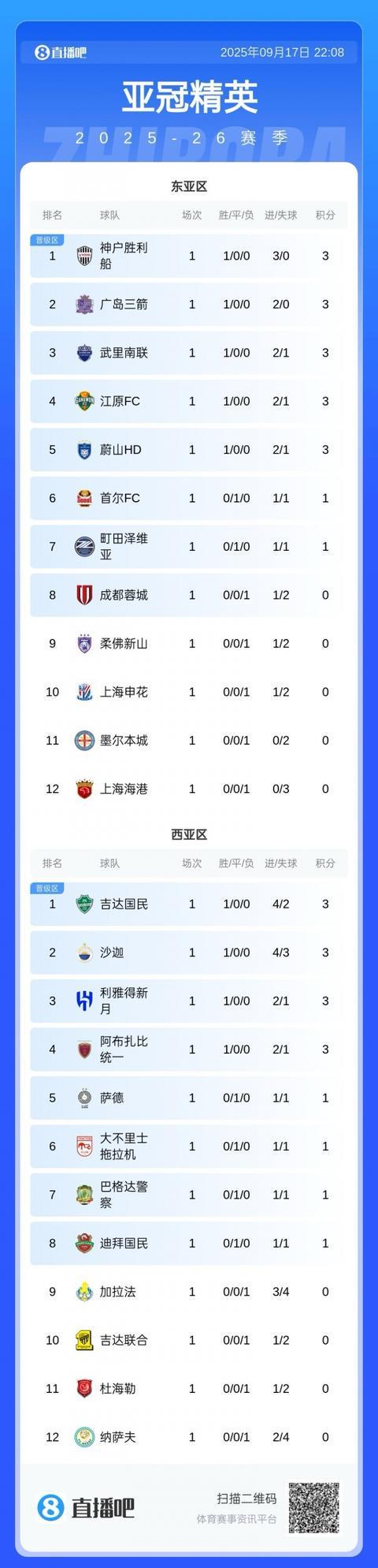 直播吧09月17日宣 亚冠精英东亚区第一轮的比赛已全部结束,最新积分榜出炉。