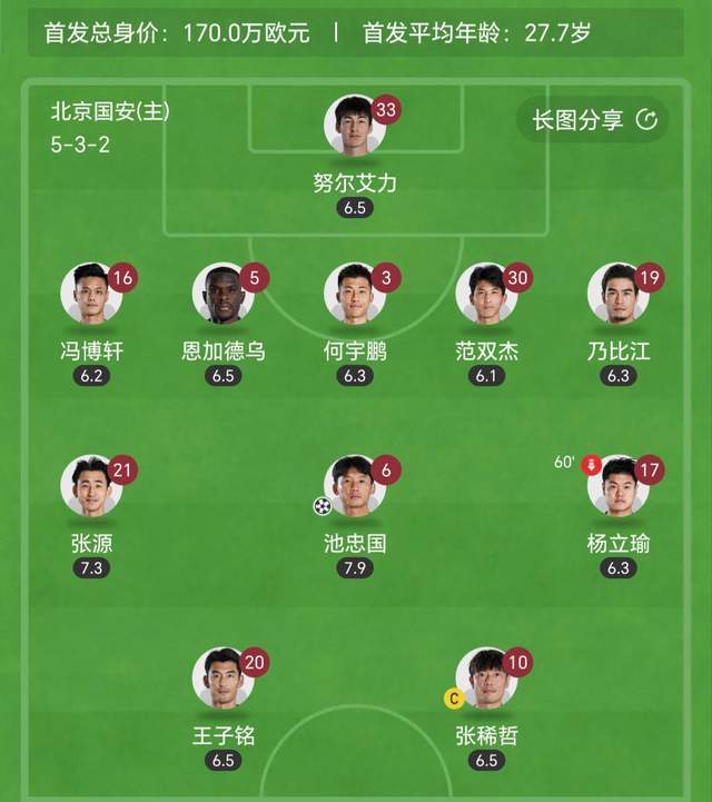 后卫线:冯博轩、恩加德乌、何宇鹏、范双杰、乃比江;